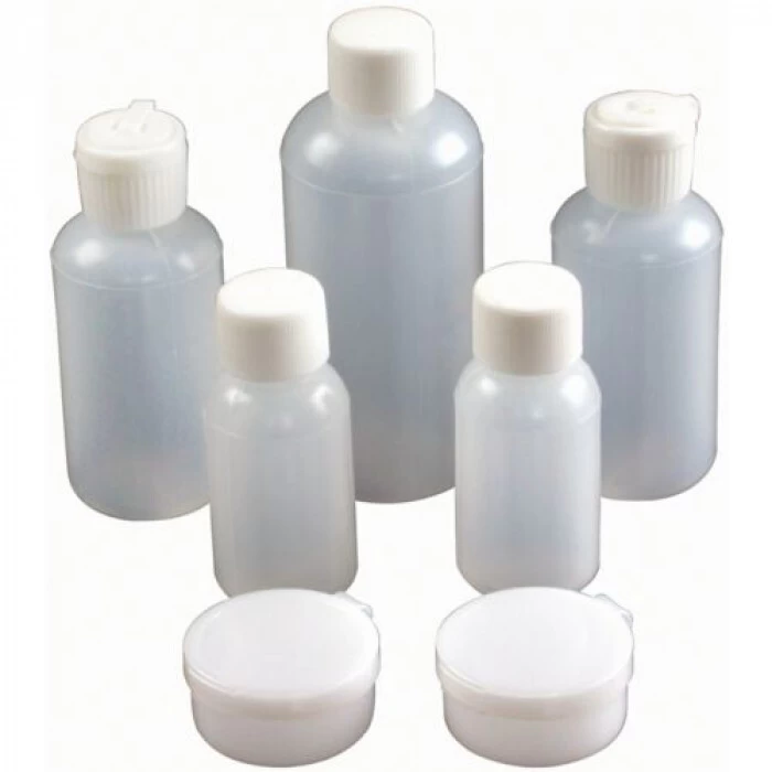 Essentials – Bagged Essentials Bottles. Five bottles with caps and two tablet or ointment containers. Two caps with spouts for honey, lotion, cooking oil etc.. Two caps for thick pouring liquids or condiments. .
